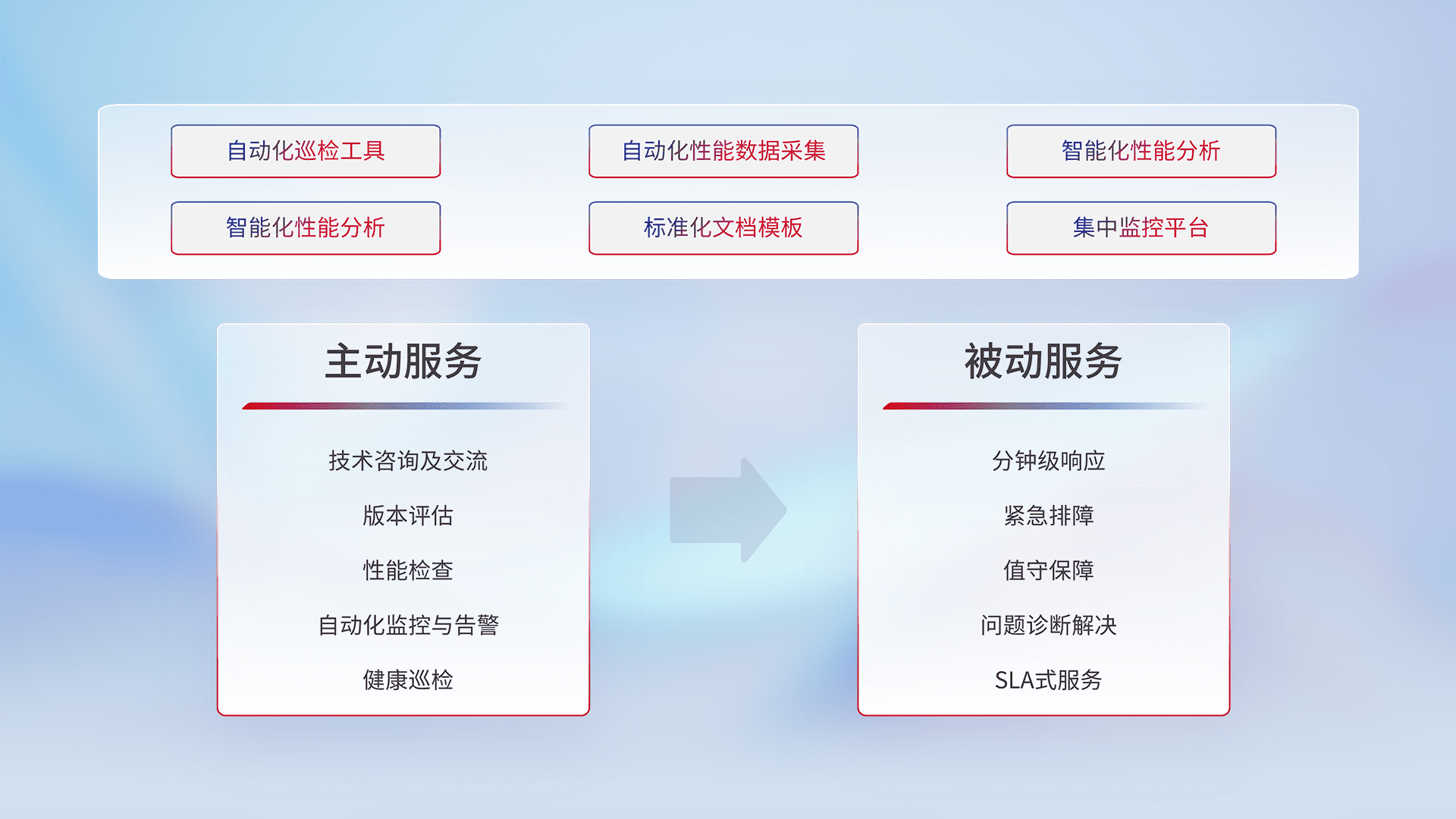 智能化工具和标准化文档,,,保障服务质量,,,,提供主动服务(包含技术咨询、、版本评估、、、、性能检查、、、、自动化监控与告警、、健康巡检)和被动服务包含(分钟级响应、、、、紧急排障、、、、值守保障、、问题诊断解决、、SLA服务)。。