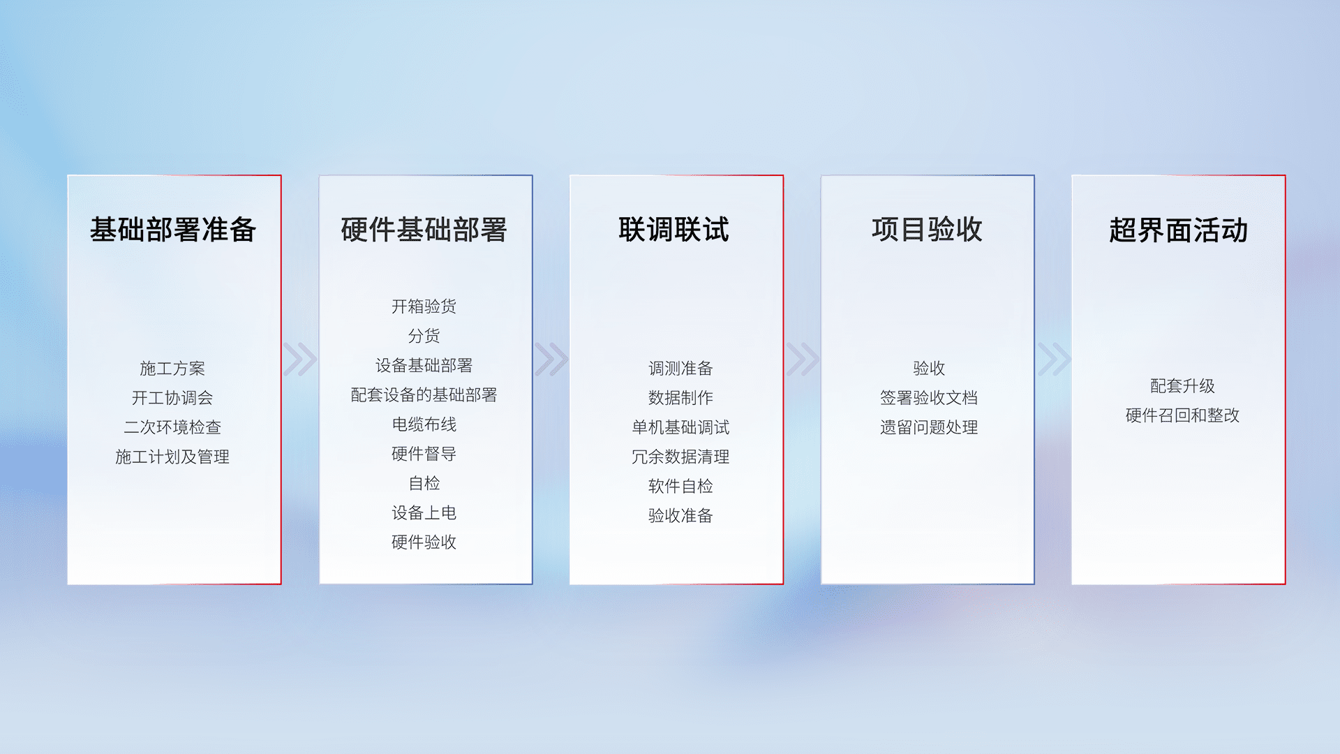 从基础部署准备、、、硬件基础部署、、、、联调联试、、、、项目验收、、越界面活动的全过程可追溯,,保证施工质量和进度。。